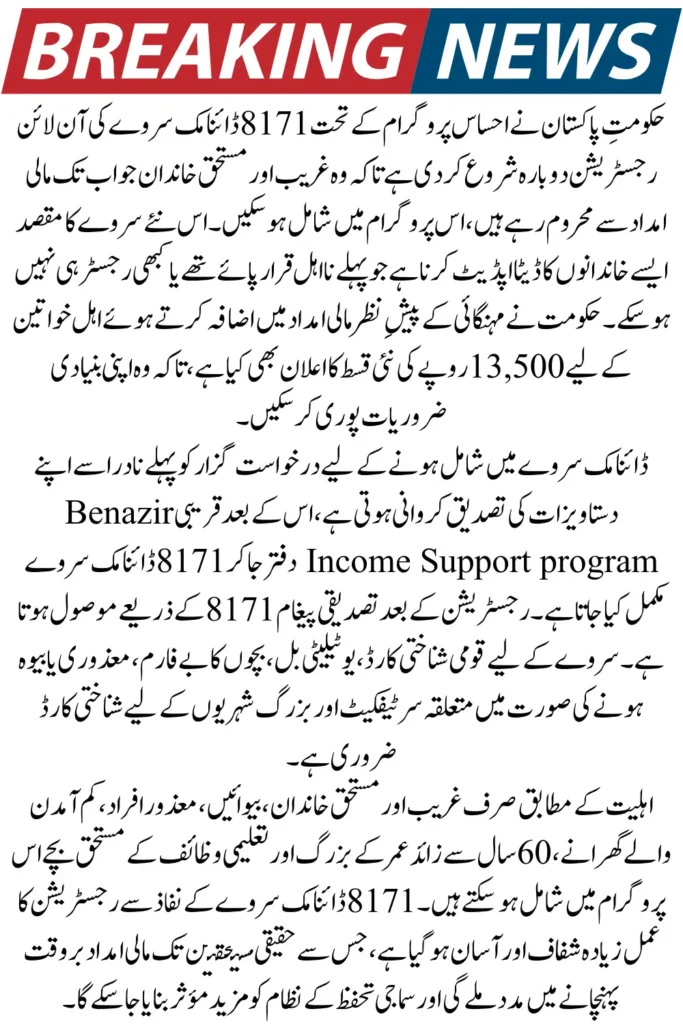 اگر اپ نے احساس پروگرام کی جانب سے رقم حاصل کرنی ہے تو اپ فورا 8171 ڈائنامک سروے کو یقینی بنائیں پاکستانی حکومت نے غریب عوام کے لیے رجسٹریشن کو دوبارہ سے شروع کر دیا ہے تاکہ ان افراد کو موقع مل سکے جنہوں نے ابھی تک احساس کی جانب سے کوئی رقم وصول نہیں کی ہے