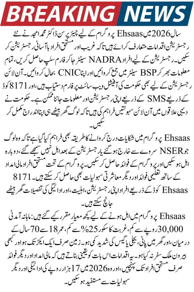 Viewers in 2026, chairperson Dr. Muhammad Amjad has presented new registration procedures for the 8171 Ehsaas program. Those who have to go to the Nadra centre and complete their registration should get their form slip from the Nadra centre as soon as possible. And read it carefully. And enter all the information asked in it and submit it back to the BSP centre. After that, you will be registered.