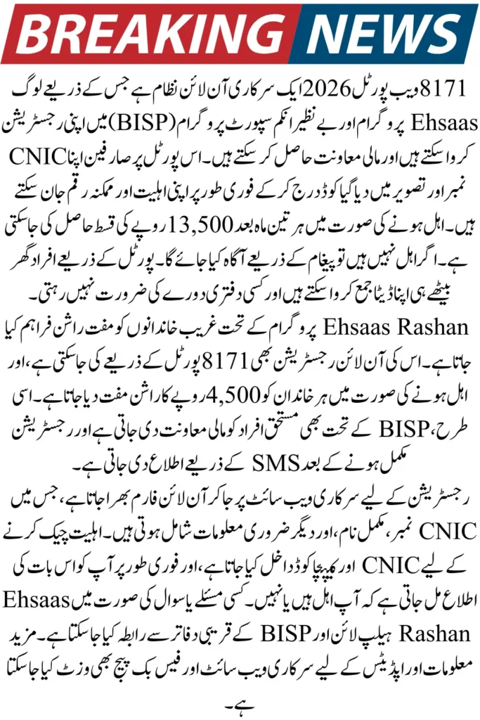 ویب پورٹل احساس پروگرام اور بے نظیر انکم سپورٹ پروگرام میں شامل ہونے کے لئے لئے آن لائن رجسٹریشن کا طریقہ کار ہے اس ویب پورٹل میں آپ اپنے آپ کو احساس پروگرام کے تمام 8171 پروگرامز اور بے نظیر انکم سپورٹ کے تمام پروگرام میں رجسٹر کروا سکتے ہیں اس ویب پورٹل میں رجسٹریشن کا طریقہ کار بالکل سادہ اور آسان ہے آپ کو صرف دئیے گئے فارم کو حل کرنا ہے اور آپ اس پروگرام میں میں شامل ہو جائیں گے اور مالی امداد حاصل کر سکیں گے احساس پروگرام میں رجسٹریشن ہونے کے لئے نیچے دئیے گئے فارم کو فل کریں