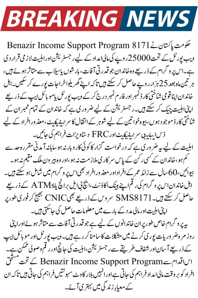 The government of Pakistan has started this program under 8171 Ehsaas Program BISP25 000