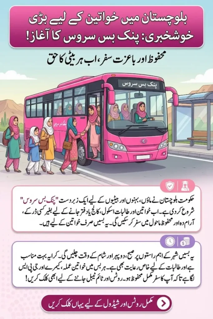 Balochistan has taken a major step toward safe and accessible public transport by launching the Pink Bus Service for women and female students. Inaugurated by Chief Minister Mir Sarfaraz Bugti, the initiative is designed to ensure secure, dignified, and convenient daily travel for women across the province. This program reflects the government’s commitment to women’s empowerment, education access, and employment opportunities.