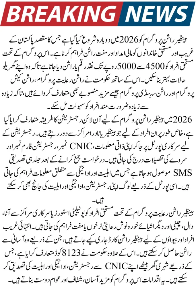 Information about registration eligibility and payment in this program will be available to those who are very poor and widows. They should get their Rashan card established as soon as possible at the Nadra center.