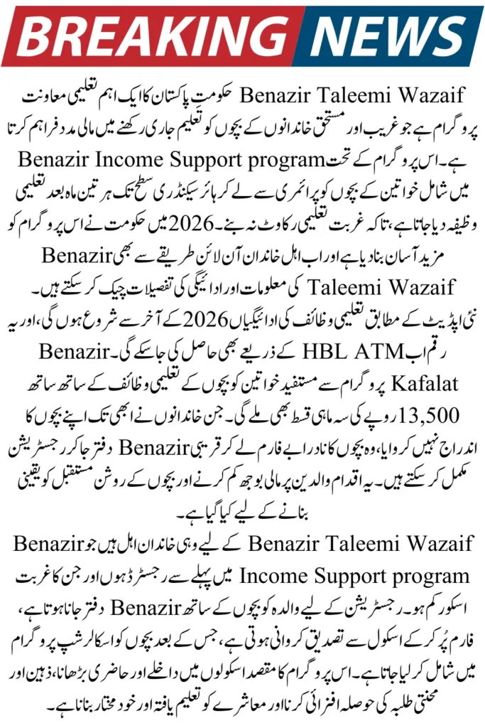 Good news for families benefiting from the Benazir Kafalat program. Women benefiting from the Benazir Income Support Program will receive their children’s Benazir Education Scholarship Program money starting at the end of 2026. If you have not yet enrolled your children in Benazir Education Scholarships, take your children’s Nadra Bay form and go to the nearest Beni office right now to register your children.