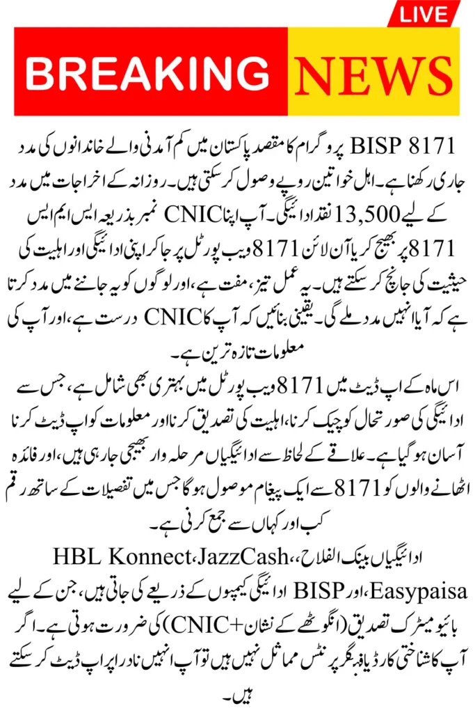 BISP 8171 program aims to continue supporting low-income families in Pakistan. Eligible women can receive a Rs. 13,500 cash payment to help with daily expenses. You can check your payment and eligibility status by sending your CNIC number via SMS to 8171 or by visiting the 8171 web portal online. The process is fast, free, and helps people know if they will receive assistance. Make sure your CNIC is valid and your information is up-to-date.