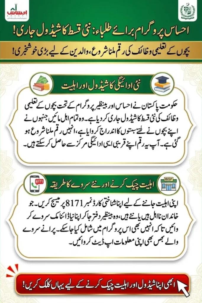 If you are worried about checking your eligibility then you can easily check your eligibility. Send your CNIC number to 8171 to check Ehsaa’s new payment. You will receive a confirmation message shortly. If you have any problem then you can go to the Benazir office established in your tehsil to get your payment.