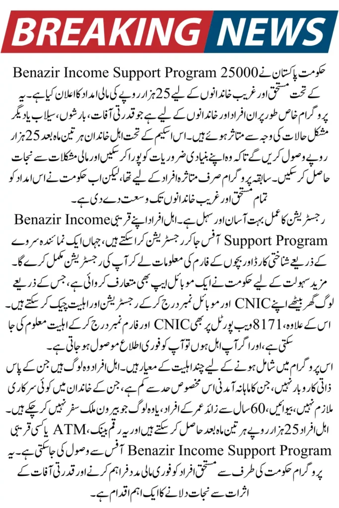 The 8171 Ehsaas Program 25000 is a special initiative by the Government of Pakistan, aimed at helping families affected by natural disasters and floods. This program provides financial assistance of 25 thousand rupees to those who are struggling due to illnesses and difficult circumstances.