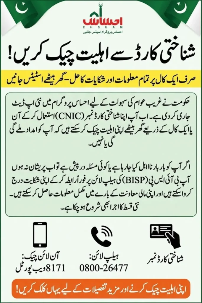 Check Eligibility through your CNIC now too through one call Government of Pakistan has created many facilities under the Ehsaas program for poor people now you can check the Ehsaas program application status check by CNIC. You can check at home whether you are eligible or not after applying to Ehsaas When you check your eligibility online, you will know whether you are eligible for Ehsaas or not.
