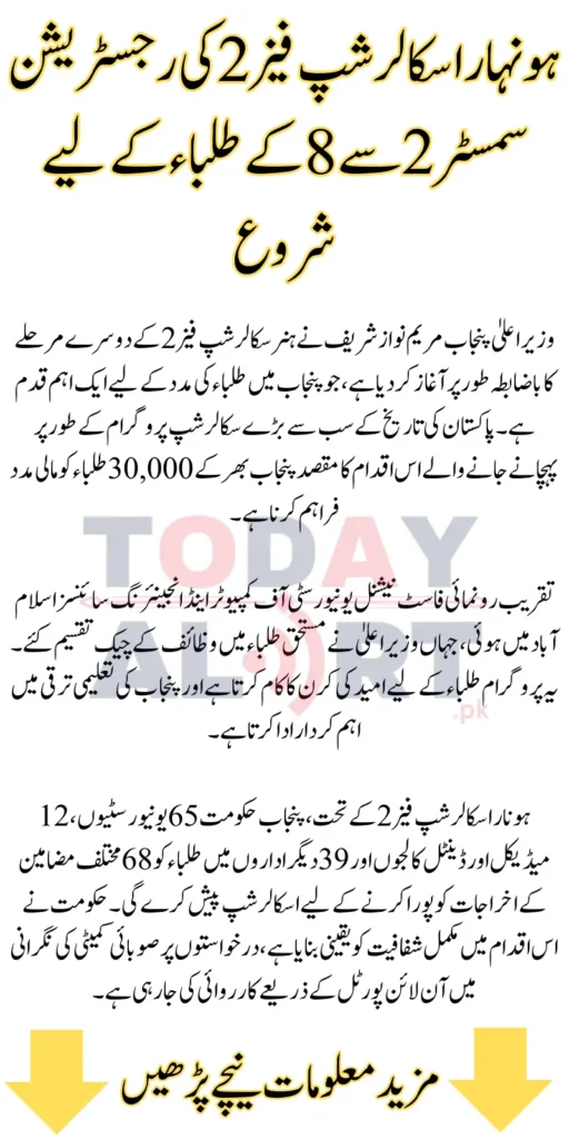 Under Honhaar Scholarship Phase 2, the Punjab government will offer scholarships to students in 65 universities, 12 medical and dental colleges, and 39 other institutions, covering expenses for 68 different subjects. The government has ensured complete transparency in this initiative, with applications being processed through an online portal under the supervision of a provincial committee.