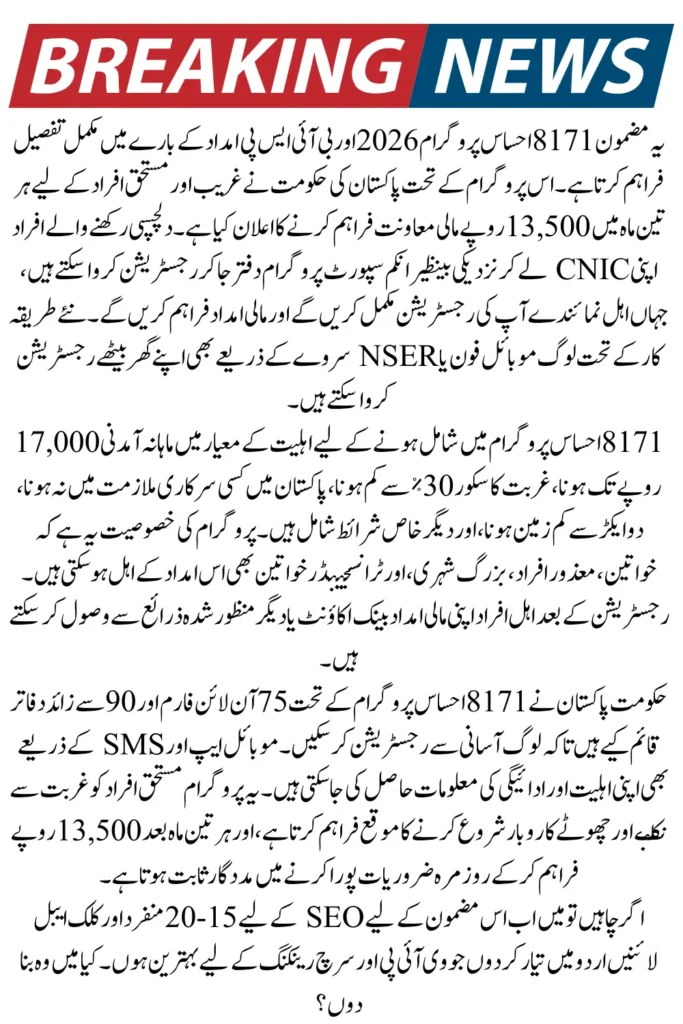 An amount of 13500 rupees is being provided every three months through the 8171 Ehsaas program.