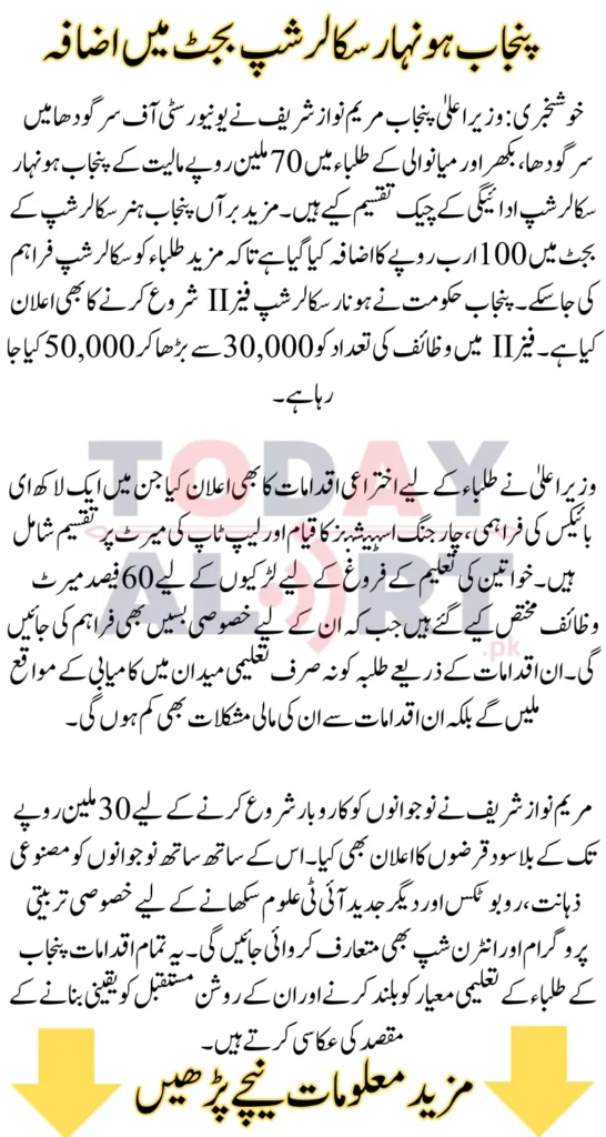 Good news: Punjab Chief Minister Maryam Nawaz Sharif has distributed Punjab Honhaar scholarship Payment Cheques worth Rs 70 million to students of Sargodha, Bakhar, and Mianwali at the University of Sargodha. In addition, the budget of the Punjab Honhar Scholarship has been increased by Rs 100 billion to provide scholarships to more students. The Punjab government has also announced the launch of Honhar Scholarship Phase II. The number of scholarships in Phase II is being increased from 30,000 to 50,000.