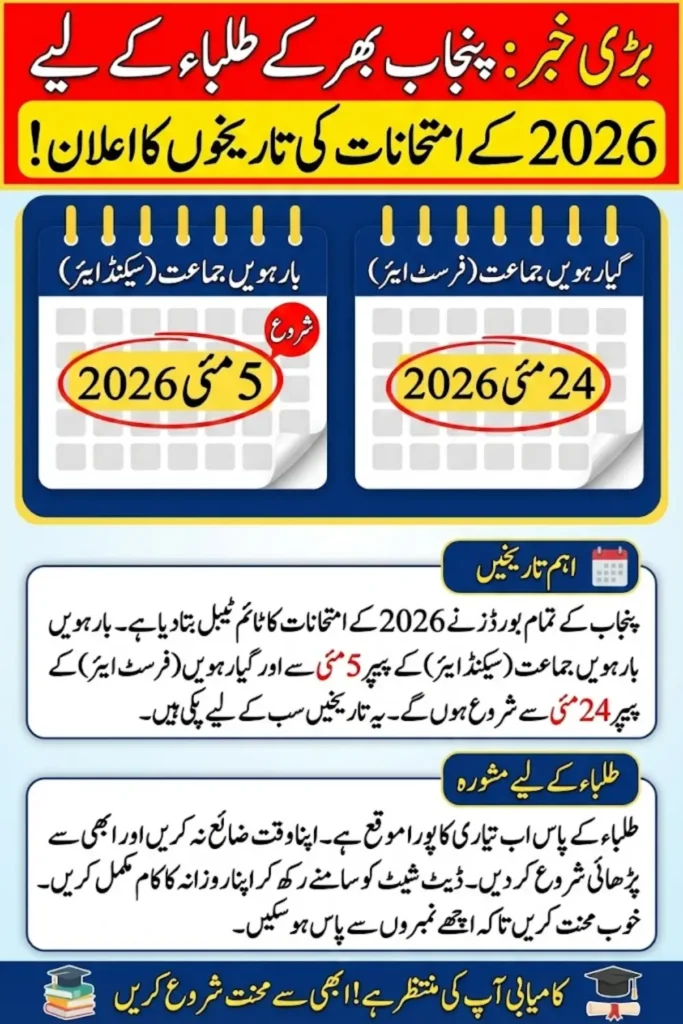 The announcement aims to give students sufficient time to plan their studies and revision strategies. By following a standardized provincial calendar, all Punjab boards, including Lahore, Rawalpindi, Multan, Gujranwala, Sargodha, Sahiwal, Bahawalpur, and Dera Ghazi Khan, will conduct exams on the same dates to ensure uniformity.